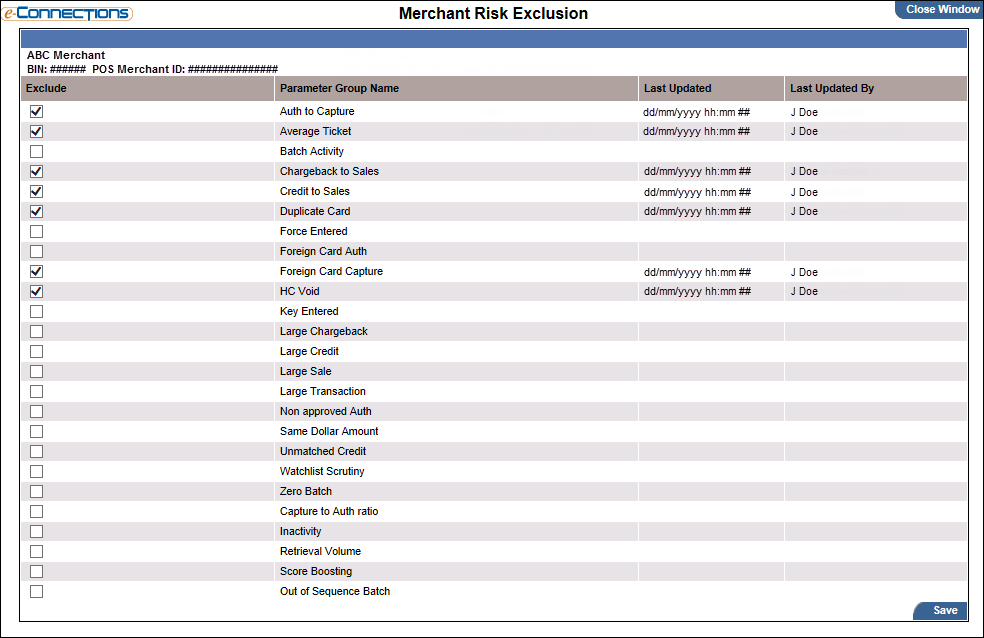 Note: If you have sufficient user privileges, you can also run the Rule Administration Merchant Risk Exclusion Report, which lists those merchants that have risk parameter exclusions applied.