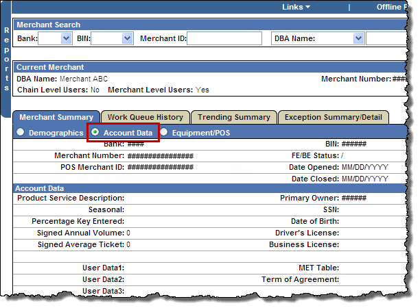 On the Merchant Summary tab, select the Account Data option button to display the merchant's account data. Account data includes annual volume, business service type, owner information, and basic processing data.