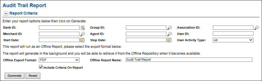 The Audit Trail Report is a comprehensive audit log of all user maintenance activity. The report can be used to query the audit log database and retrieve details for specific activity on a merchant, by user, and/or by type of function. A date range of 1-31 days is available per query.